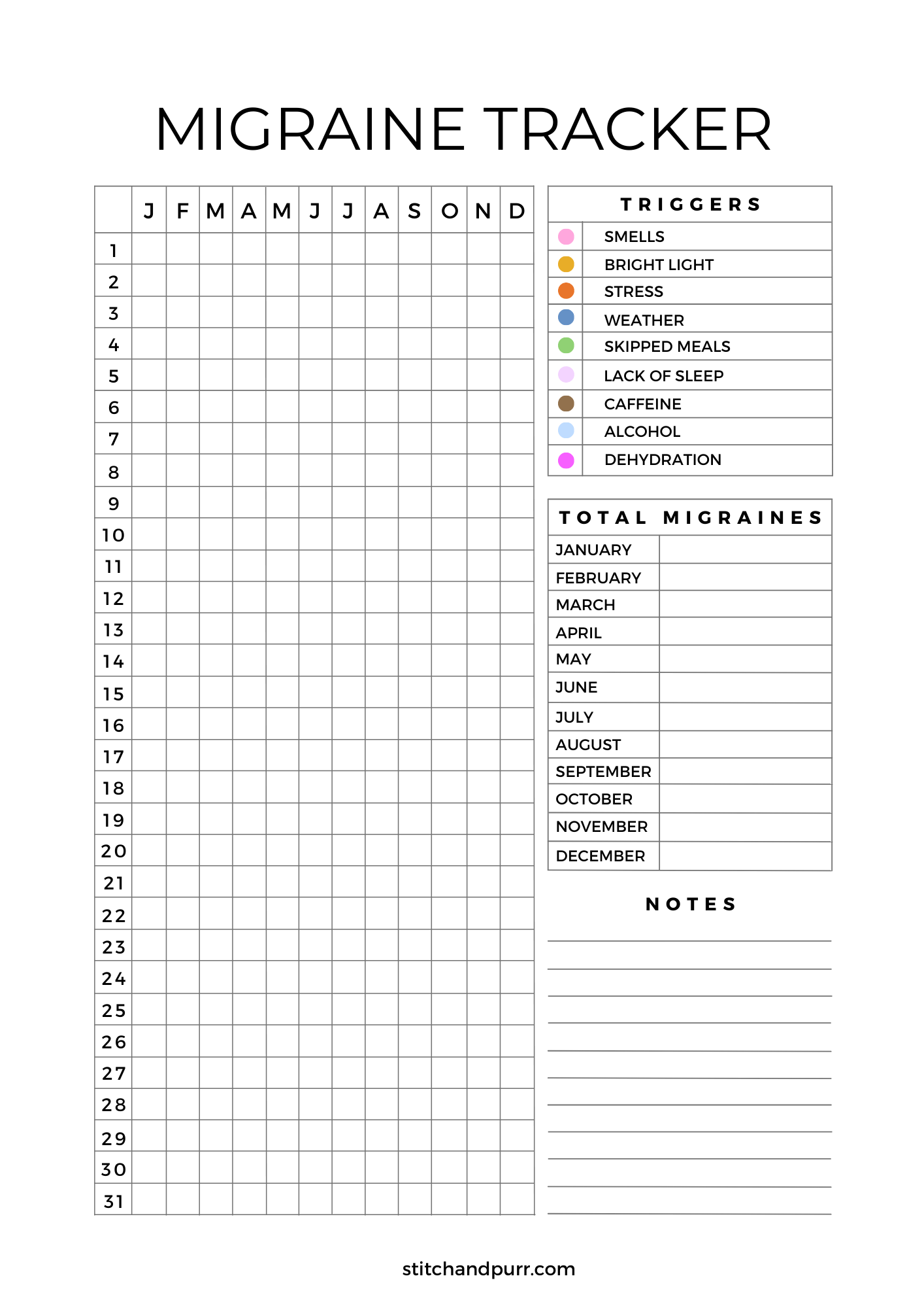 It wasn’t until my last doctor’s appointment that I had ever thought of actually tracking my migraines. My doctor has referred me to a neurologist to see if they can narrow down my migraines to see which medicine will be best for me. She suggested I start tracking them to give a good overview for my neurologist. I’ve been using a really great app on my phone to track them easily. Migraine Buddy is a free app where you can track your migraines, triggers, and symptoms. It has helped immensely. But I thought not everyone has a phone with apps, so I made my own monthly tracker that anyone can print and use.